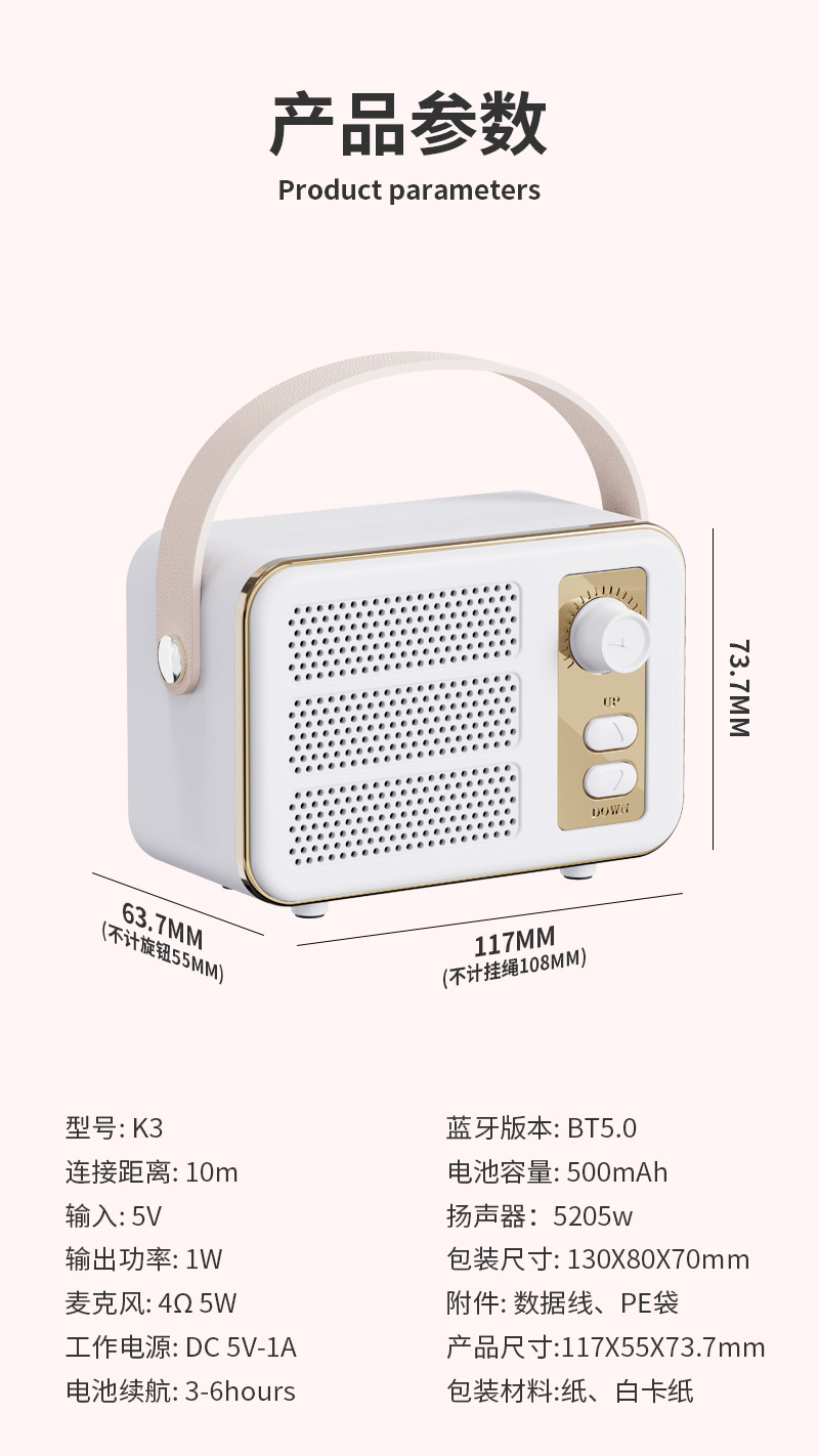 | 颜色 | K3复古粉色, K3复古白色, K3复古紫色, K3复古绿色 |
