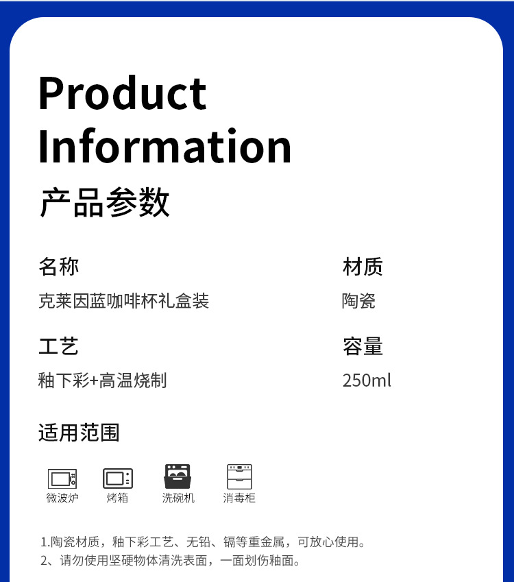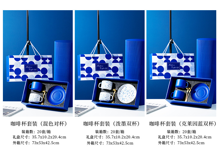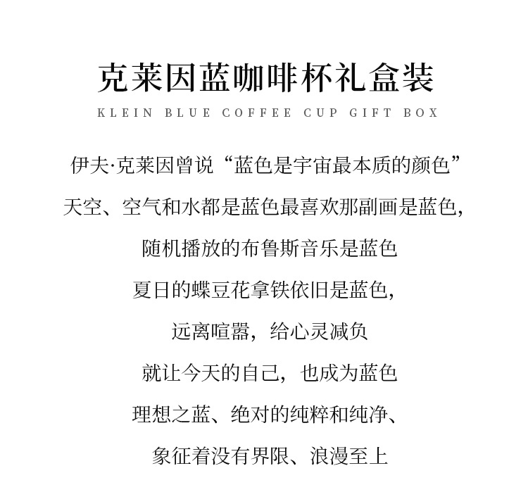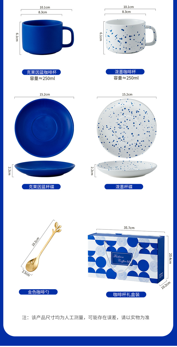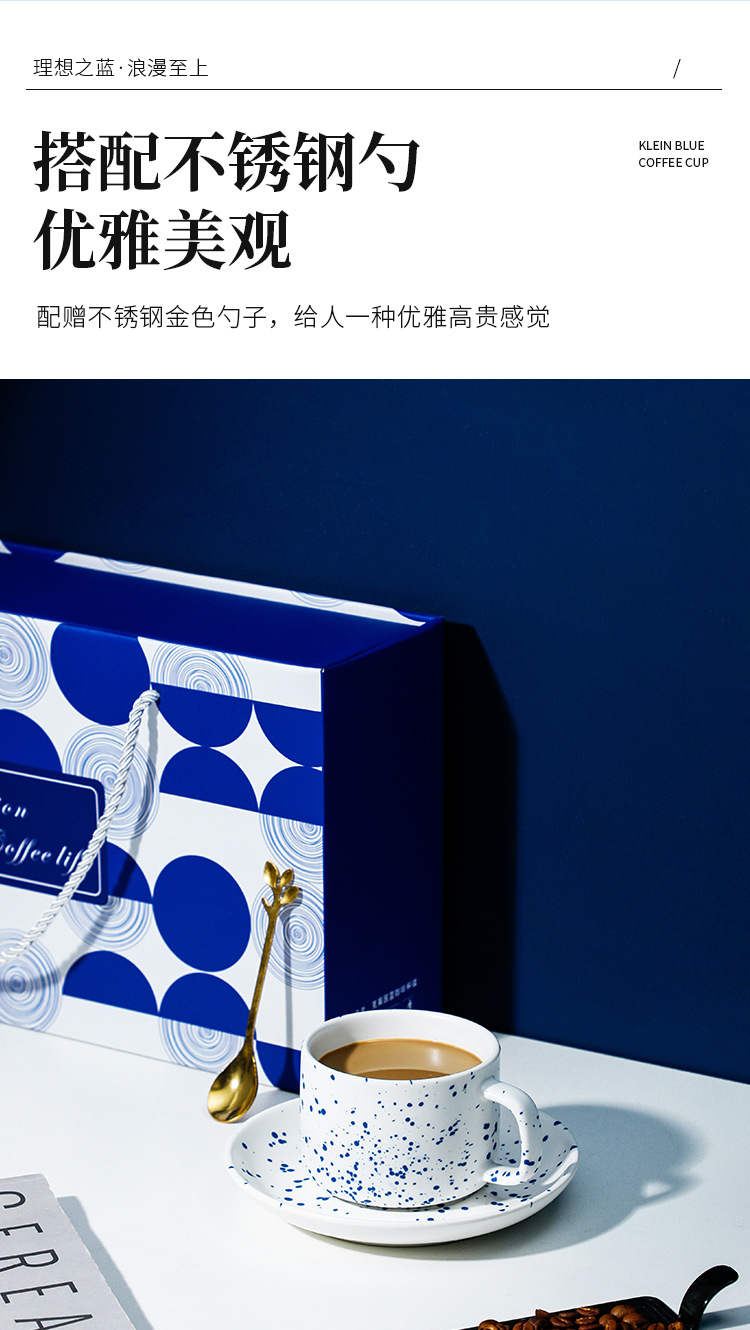 | 颜色 | 克莱因蓝咖啡杯碟【纯色】两杯两碟彩盒装, 克莱因蓝咖啡杯碟【喷点】两杯两碟彩盒装, 克莱因蓝咖啡杯碟【混装】两杯两碟彩盒装 |