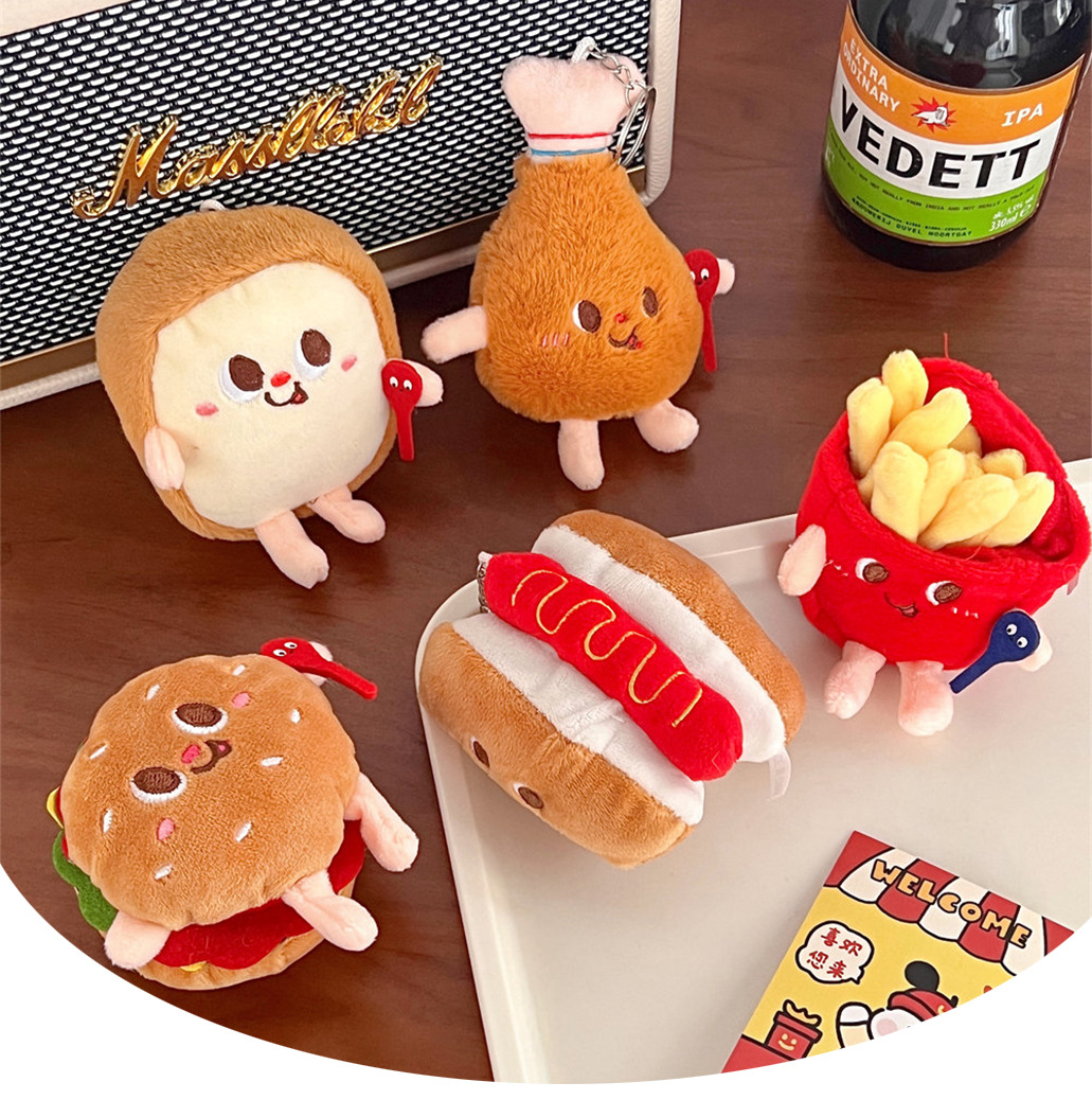 | 颜色 | 1#毛绒公仔吐司钥匙扣, 2#毛绒公仔鸡腿钥匙扣, 3#毛绒公仔热狗钥匙扣, 4#毛绒公仔汉堡钥匙扣, 5#毛绒公仔薯条钥匙扣 |