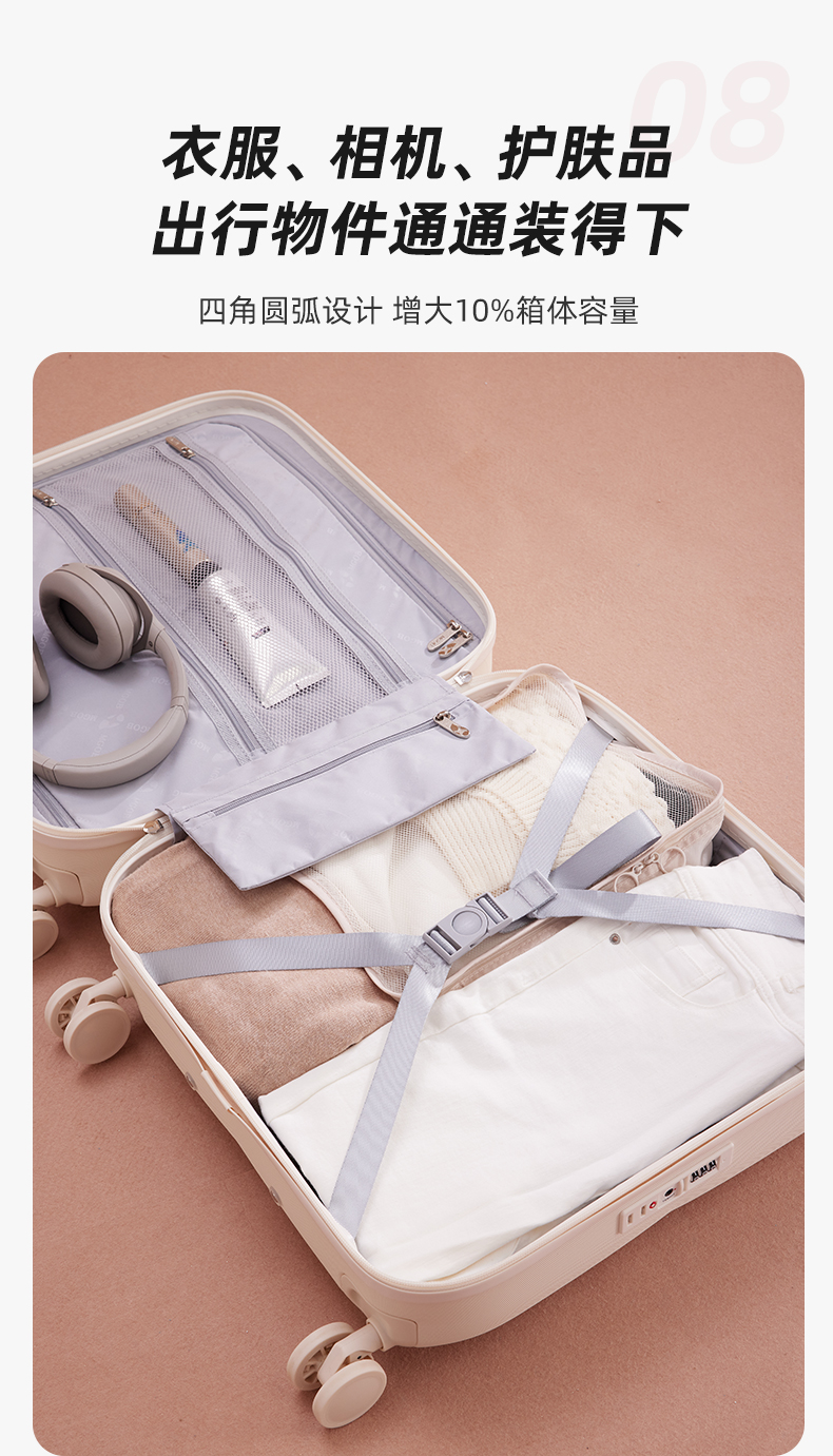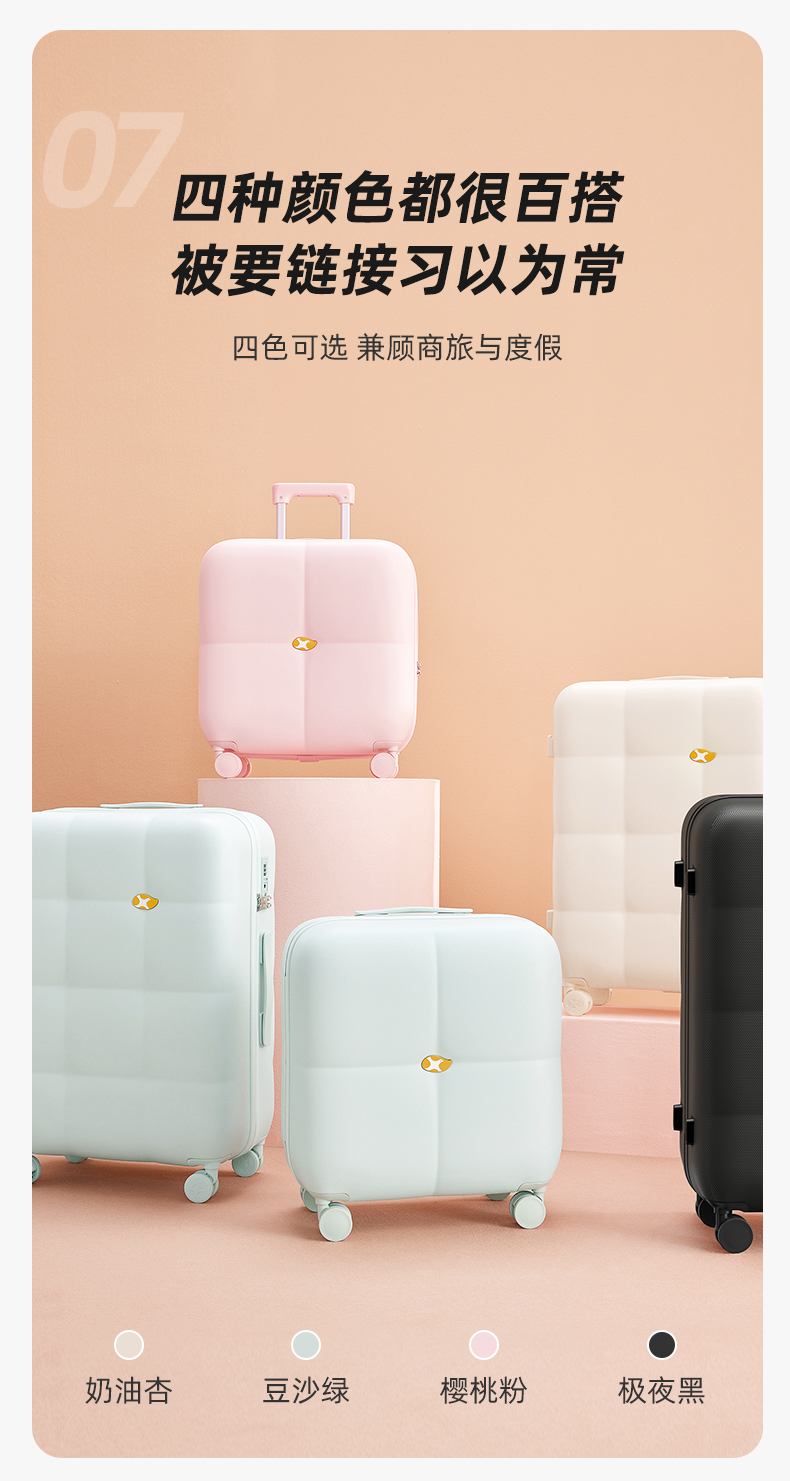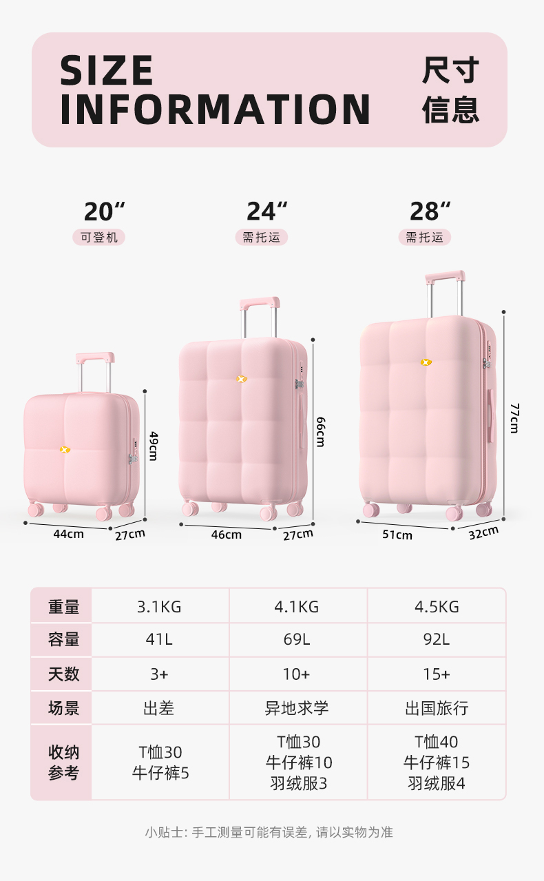| 尺寸 | 20寸【通用可登机/适合1到5天旅行】, 24寸【需要托运/适合5到10天旅行】, 28寸【需要托运/求学/出远门推荐】 |