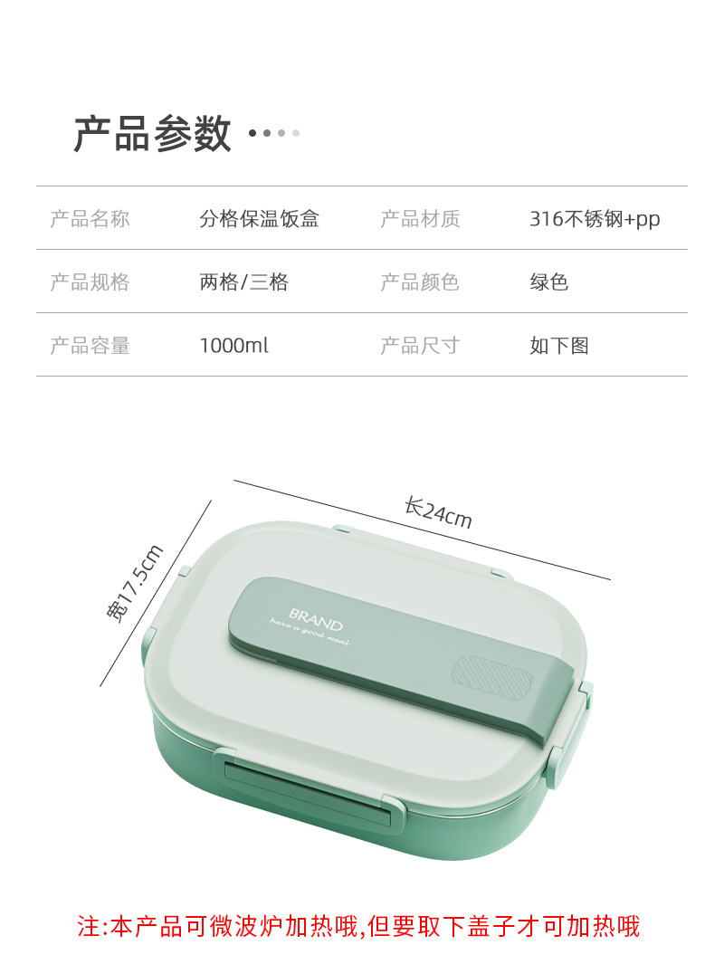 | 规格 | 【两格】1000ml, 【三格】1000ml, 【两格】1000ml+保温袋, 【三格】1000ml+保温袋, 【两格】1000ml+保温袋+汤碗, 【三格】1000ml+保温袋+汤碗 |