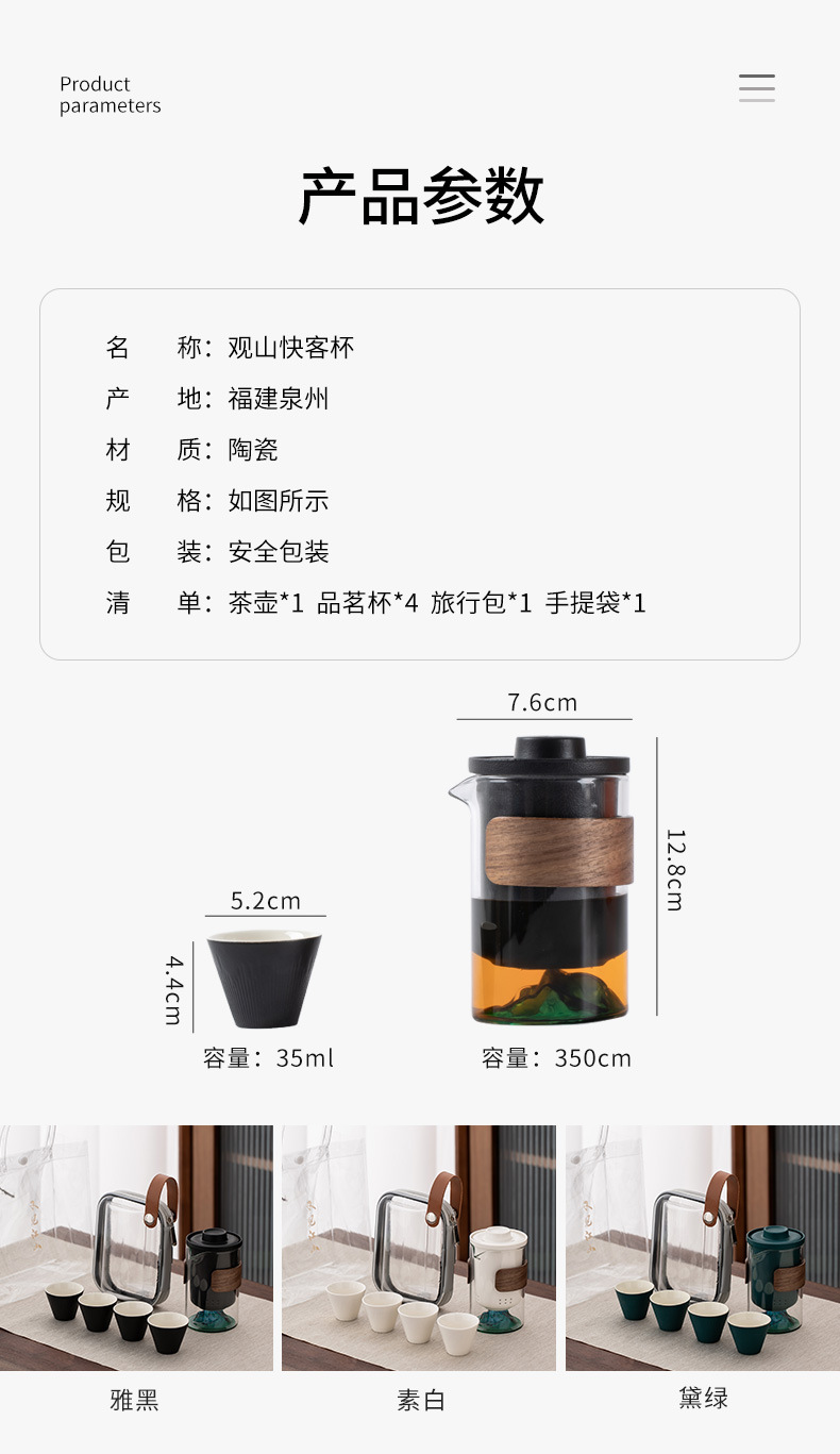 | 颜色 | 观山一壶三杯【白色】, 观山一壶三杯【绿色】, 观山一壶三杯【黑色】, 一条好龙快客杯, 双龙戏猪快客杯, 又见观山一壶四杯【素白】, 又见观山一壶四杯【雅黑】, 又见观山一壶四杯【黛绿】, 一壶三杯观山【绿色】, 一壶三杯观山【橙色】, 一壶三杯观山【蓝色】, 一壶三杯观山【磨砂黑】, 一壶三杯观山【素白】, 一壶三杯观山【一路相随】, 一壶三杯观山【千里江山】, 一壶三杯观山【飞鹤】, 玻璃旅行快客杯白色【一壶三杯旅行包】, 玻璃旅行快客杯黑色【一壶三杯旅行包】, 玻璃旅行快客杯白色【一壶三杯旅行盒】, 玻璃旅行快客杯黑色【一壶三杯旅行盒】 |